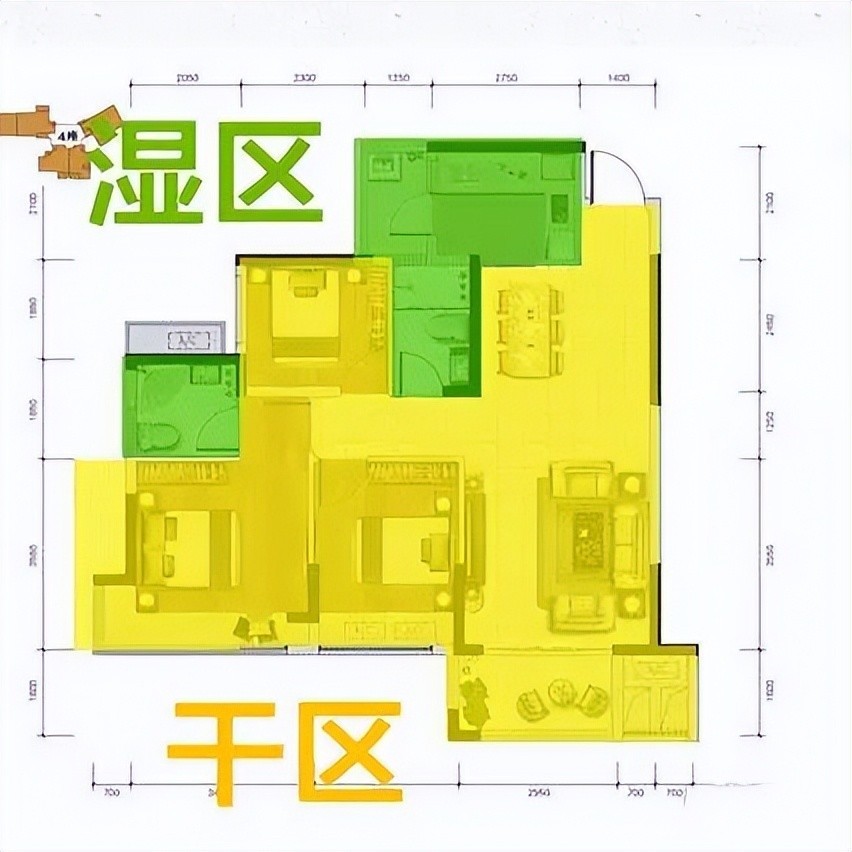 就是把保持干燥空间与常用水的区域分离。就是卧室、客厅和厨房、卫生间是要分开的,动静分区和干湿分离结合一下。