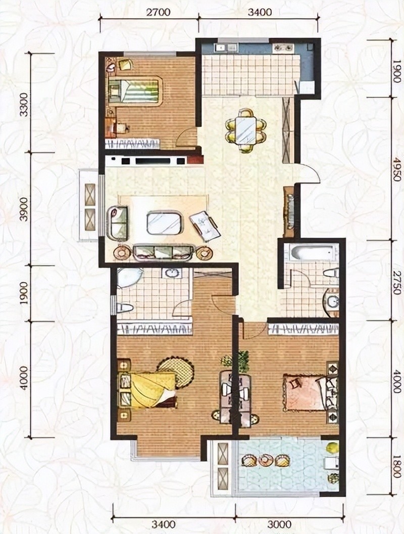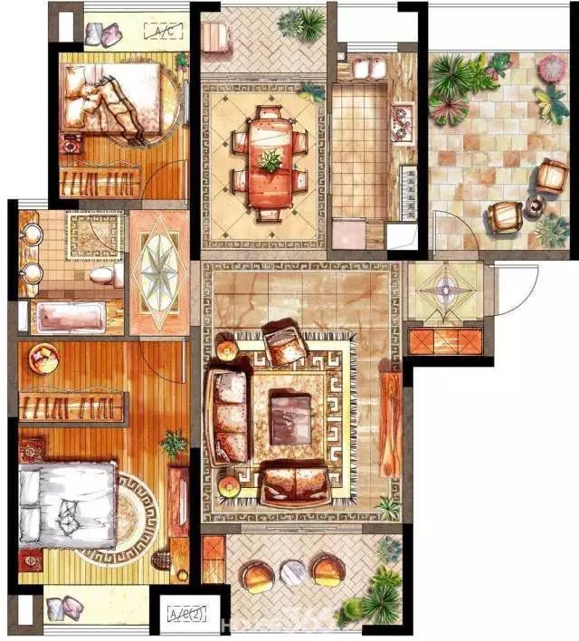 反而像下面这种户型图,非常貌美,看起来非常符合时下审美,所有家具的位置也都给你标注了,但是连尺寸都没有,其实作用并不大。