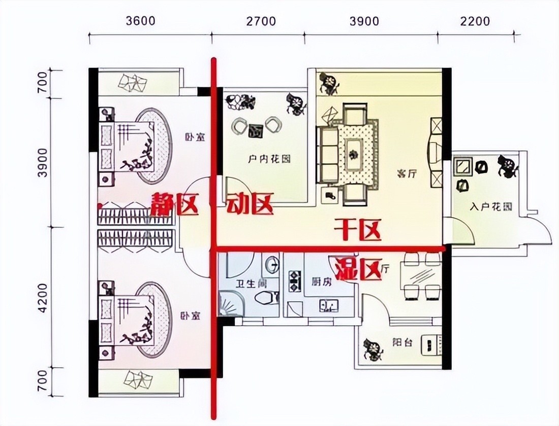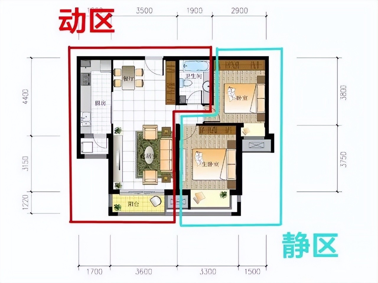 动区是指客厅、厨房、阳台等活动区;静区是指卧室、书房等休息区;动静分区就是把这两类场所分开,互不干扰。不是一块一块琐碎分割开来的,而是两个大块。