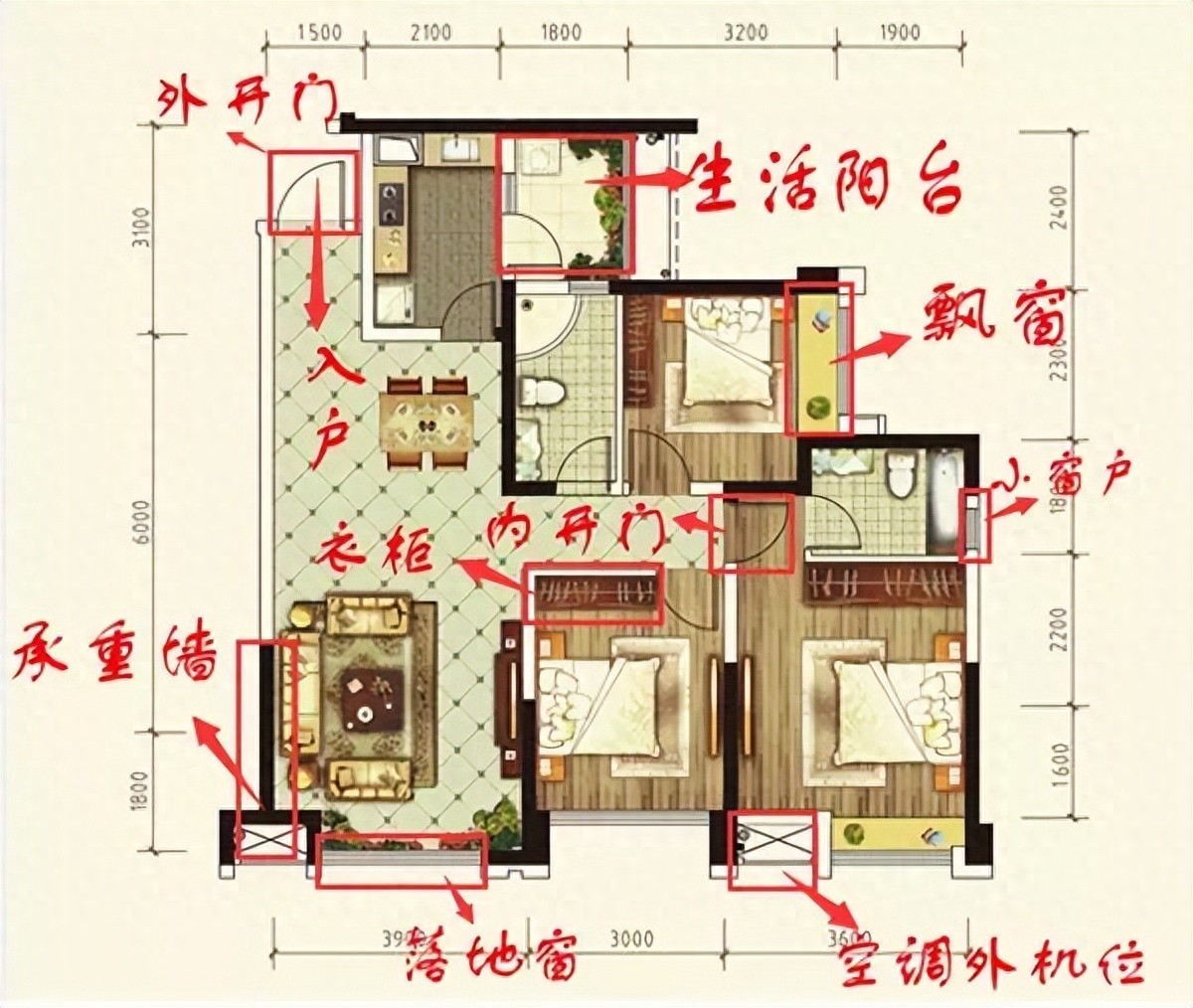 一般客厅和卧室外墙都应该留有统一的空调机位置,一个矩形中间一个×的就是空调外机位。