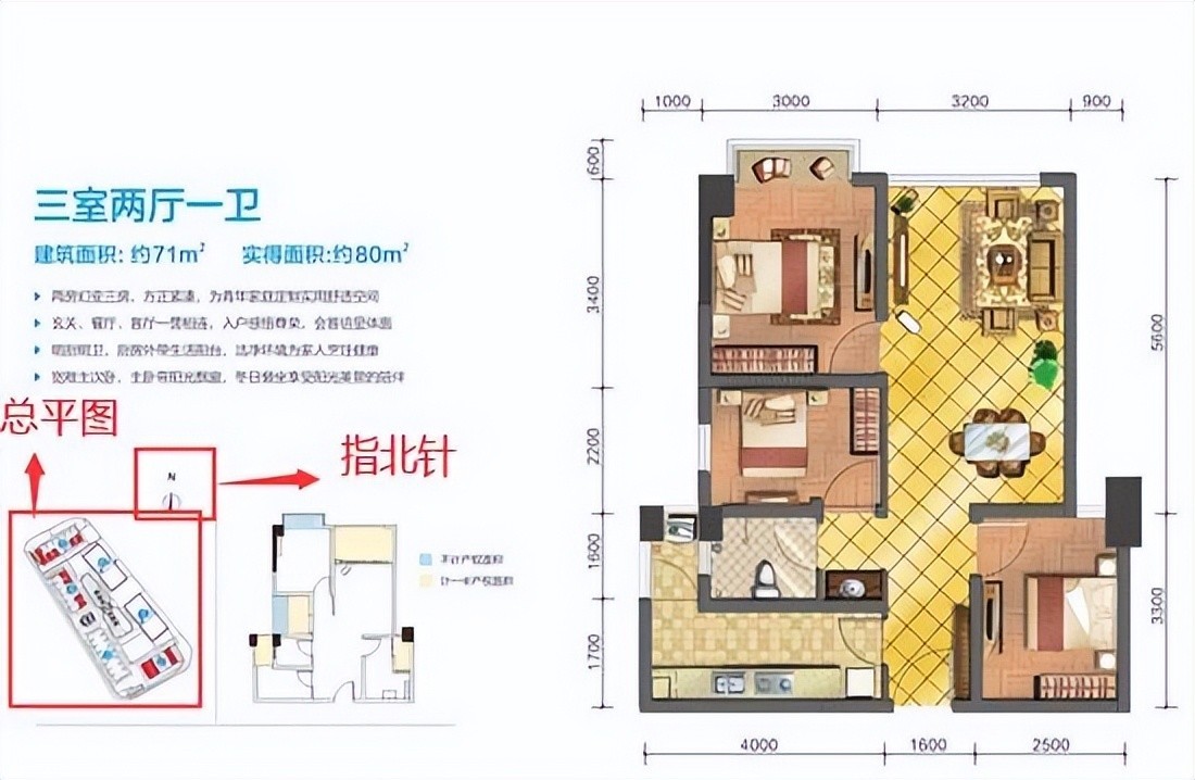 户型图旁边,一般会有一个总平图,会明确标注小区的楼栋分布,本户型所在位置。可以根据这个总平图判断房子的具体方位。总平图上还会有一个指北针,没有标注的话,就默认是上北下南左西右东。
