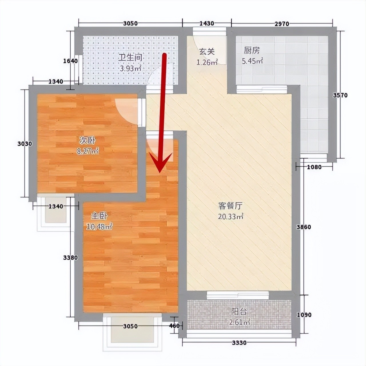 如下图,北侧的次卧宽2.7米、长3.3米,面积有9平米左右,足够放下床和书桌,房间最重要的就是大小合适。