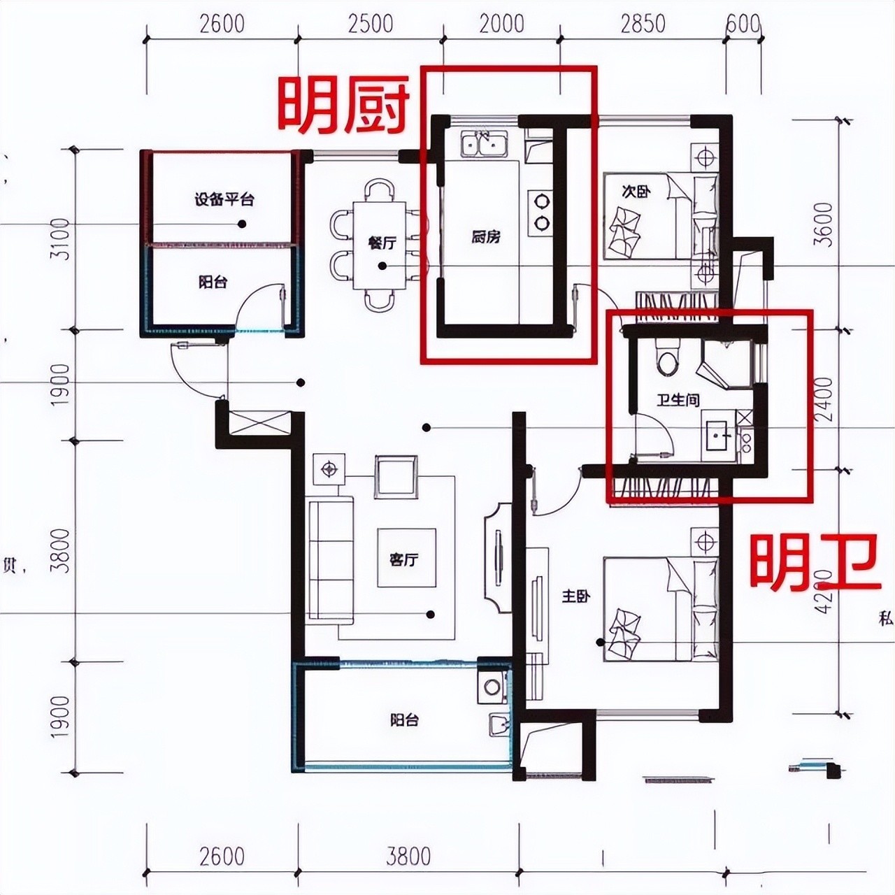 厨房和卫生间都要有窗户,光线条件比较好。相反的是暗厨暗卫,两者都没有窗户。